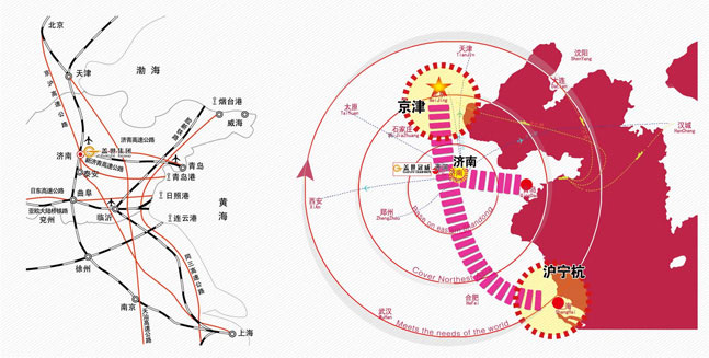 济南是环渤海经济区及京沪发展轴上的中心城市,是全国45个公路主枢纽和21个物流节点城市之一,境内公路、铁路、航空、内河运输方式齐备,通道发达,被国家确定为“电子商务与现代物流示范工程”试点城市,率先形成了省会城市与16地市以高速公路网相连的“半日生活圈”。物流辐射范围广,发展成为区域物流中心城市和物流节点城市的地缘条件十分突出。